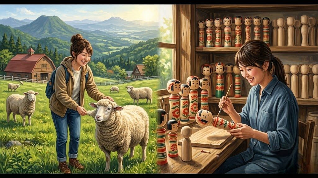 - 石段街の散策だけでなく、牧場体験やこけし絵付けなどの周辺アクティビティを組み合わせる